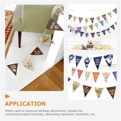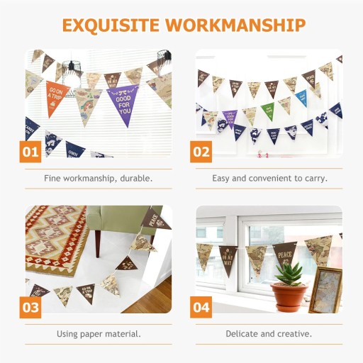 Czy jesteś zainteresowany posiadaniem ozdobnych chorągiewek? Wykonany z materiałów papierowych ze szczegółowym wykonaniem, z pewnością może dodać wesołej i przytulnej atmosfery do dekoracji z okazji powrotu do szkoły lub dowolnej okazji. Ta trójkątna chorągiewka zapewni dobre wrażenia, mapę świata i motyw podróży, ładny nadruk, może być również miłym rekwizytem fotograficznym, aby pozostawić niezapomniane wspomnienia.
