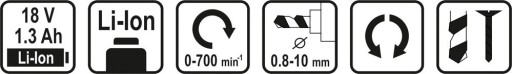 Kompaktowa wiertarko-wkrętarka 18 V. Wyposażona w stalową przekładnię, zabezpieczenie przeciw przegrzaniu baterii, precyzyjny uchwyt narzędziowy 0,8-10 mm. Typ baterii: litowo - jonowa, 1,3 Ah: prędkość obrotowa 0-700 obr/min: moment obrotowy 17 Nm.