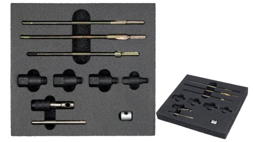 prowadnicę rozwiertaka 4 szt (M8x1 mm, M10x1 mm, M10x1.25 mm, M12x1.25 mm) rozwiertak 3 szt (M5-M7, M6-M8, M7-M10) pokrętło z przetyczką ogranicznik