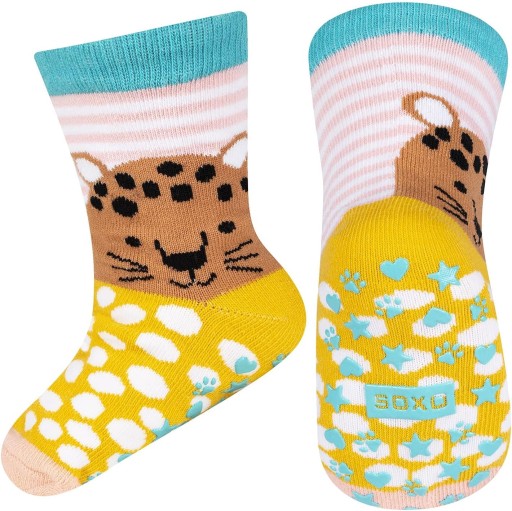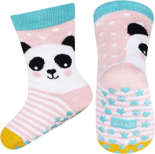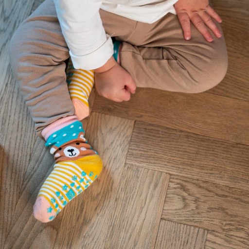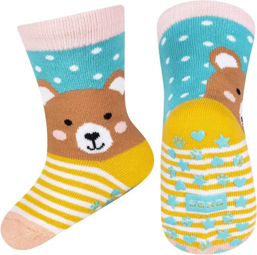 Skarpety antypoślizgowe posiadają na spodzie antypoślizgowy wzór, który zapewnia bardzo dobrą przyczepność do podłoża. Dzięki temu dziecko może bezpiecznie poruszać się po śliskich powierzchniach.