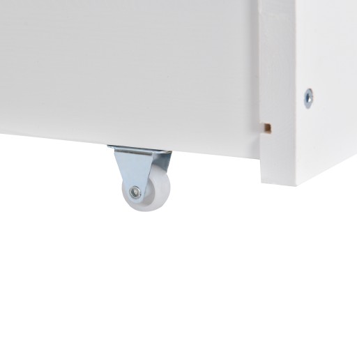 Biała szuflada na kółkach posłuży do przechowywania ubrań i zabawek, a dwa rzędy półek po prawej stronie pomieszczą ulubione akcesoria. Kompleksowa funkcja przechowywania pozwala racjonalnie zaaranżować przestrzeń.
