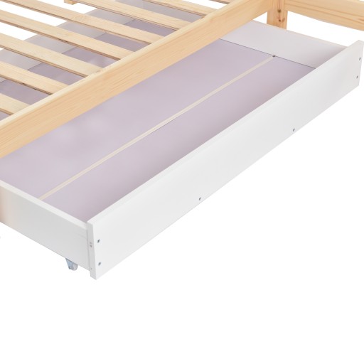 Łóżko dziecięce domek z szufladami i półkami, lite drewno z płotem i ramą z listew, struktura L, naturalny (90x200 cm+140x70cm)