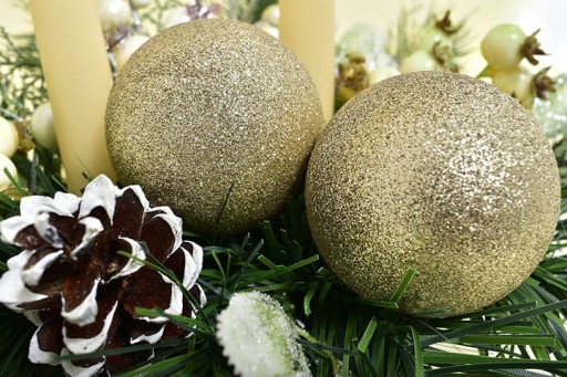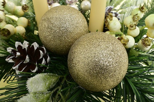 ✅ Eleganckie, złote bombki z brokatem migoczą w świetle, tworząc urokliwy efekt rozświetlając całą kompozycję.