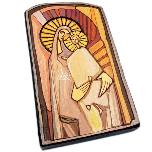 Ikona z malowanym wizerunkiem Matki Bożej z Dzieciątkiem wykonana na kształtnym kawałku drewna. Wizerunek pokryty został werniksem dzięki czemu wizerunek pozostanie nienaruszony przez lata.