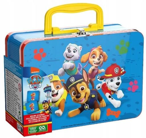 Zawiera 72 karty do gry ze wszystkimi ulubionymi postaciami Paw Patrol i metalową walizkę do przechowywania z uchwytem.