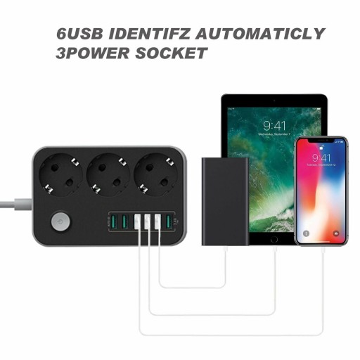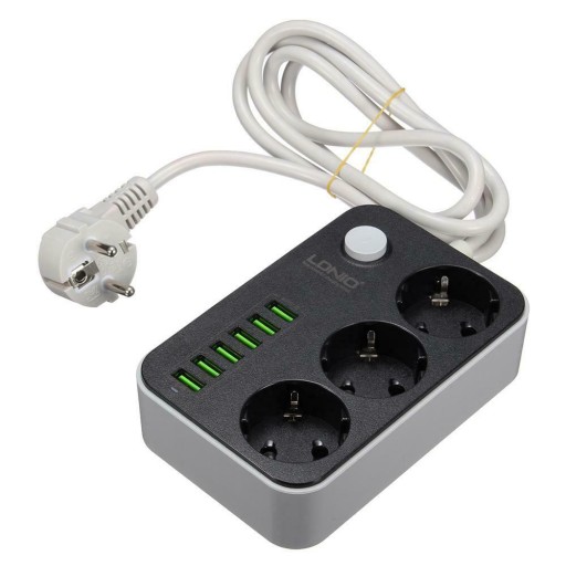 Listwa zasilająca posiada 6 portów USB i 3 gniazda sieciowe, co pozwala na równoczesne podłączenie aż 9 różnych urządzeń.