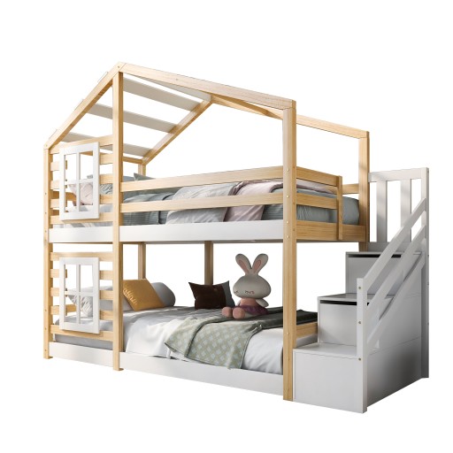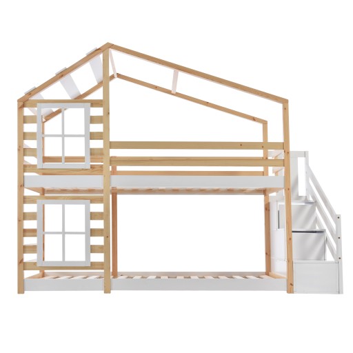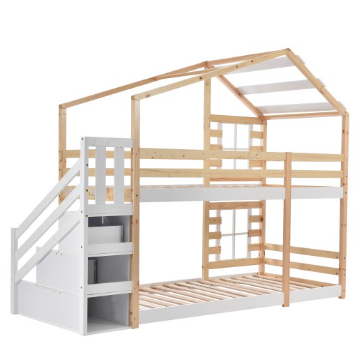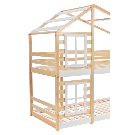 Łóżko dziecięce domek na drzewie z szufladą i zabezpieczeniem przed upadkiem 90 x 200 cm, łóżko na poddaszu dla dzieci - 2x ramy z listew - naturalny i biały