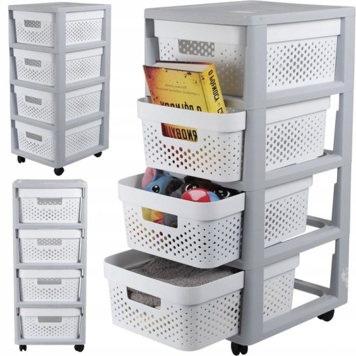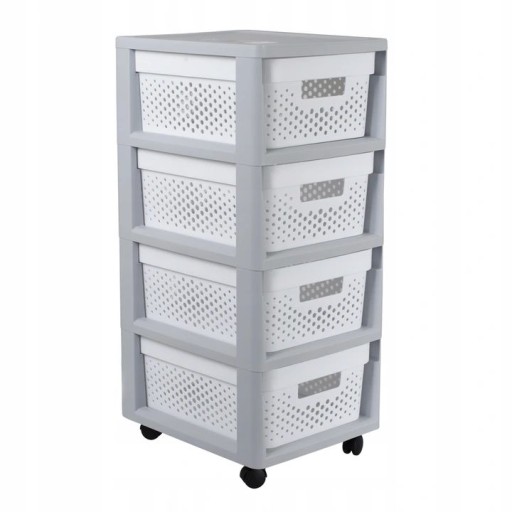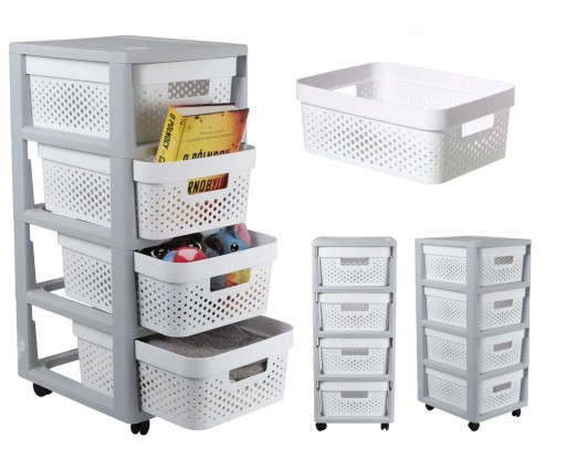 Wysokiej jakości materiał z jakiego wykonano regał sprawia, że komoda jest solidna i trwała. Regał składa się z czterech szuflad o pojemności 11L i pozwala na łatwe zorganizowanie przestrzeni. Prezentowana komoda zapewnia, że przechowywane przedmioty są zabezpieczone przed uszkodzeniami, zabrudzeniami oraz działaniem innych czynników zewnętrznych. Dołączone do mebla praktyczne kółeczka pozwalają na swobodne jego przemieszczanie.