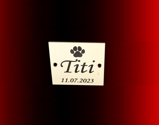 Tabliczka wykonana z mosiądzu grawerskiego szczotkowanego (kolor złoty) fabrycznie zabezpieczona lakierem bezbarwnym do zastosowań wewnętrznych i zewnętrznych. Grawer wykonany techniką graweru wklęsłego, grawer patynowany na kolor czarny. Wymiary tabliczki 100 x 100 mm. Tabliczka posiada dwustronną bardzo mocną taśmę piankową do montażu na zewnątrz. Na życzenia klienta wykonuję otwory do przykręcenia za pomocą mosiężnych wkrętów (wkręty w cenie tabliczki). Istnieje możliwość wykonania tabliczek o innych wymiarach, wtedy cena ustalana jest indywidualnie.