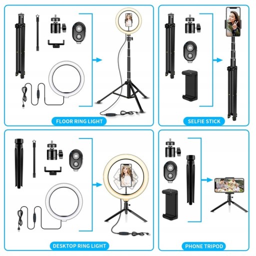 Wielofunkcyjny i nieograniczony kąt świecenia - konstrukcja 2 w 1 łączy lampkę pierścieniową LED i uchwyt na telefon razem i może obracać się o 360°. W lampie i na słupie zainstalowane są dwa uchwyty na telefon komórkowy, co jest wygodniejsze w przypadku transmisji na żywo i filmowania pod różnymi kątami. Mini statyw ze śrubą blokującą można dowolnie składać i składać. Zacisk do telefonu komórkowego jest również regulowany i nadaje się do większości telefonów komórkowych, których szerokość ekranu wynosi od 5,1 do 8,3 cm