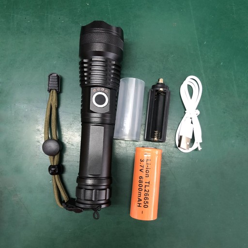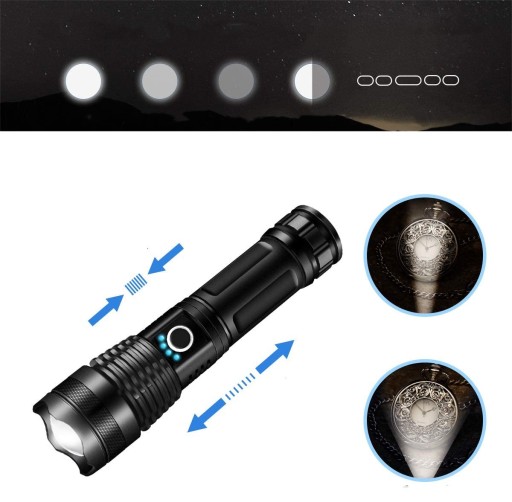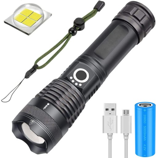 - Akumulatorowa latarka jest zasilana przez akumulator, który można ładować za pomocą zwykłego gniazdka lub USB.