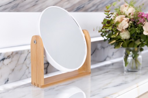 ✅ Styl - Delikatne, białe obramowanie i bambusowy stojak nadają temu lusterku elegancki, minimalistyczny wygląd, który komponuje się z każdym wnętrzem.