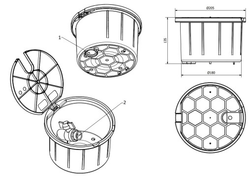 Jest to pojemnik z tworzywa sztucznego z pokrywą zamontowaną na zawias. Wewnątrz studzienki został umieszczony metalowy zawór kulowy. Zawór posiada przyłącza gwintowane 3/4 cala na wlocie jak i wylocie. Studzienkę poboru wody z zaworem 3/4" należy zamontować na równi z gruntem, tak aby było możliwe otwarcie pokrywy. Zalecamy podłączenie studzienki w wodę, wykonać przy pomocy kolana PE GZ 3/4 cala.
