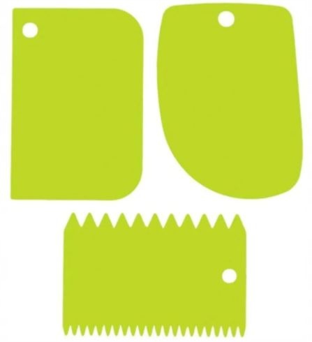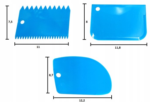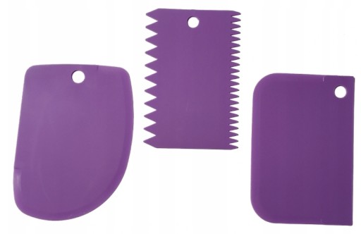 Zestaw trzech szpatułek do tworzenia dekoracji cukierniczych - ciasta, tortu, itp. Każda łopatka ma inny kształt.