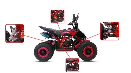 W przeciwieństwie do innych tego typu pojazdów nasz zestawiony jest na dużych 6 calowych kołach pompowanych dzięki czemu quad świetnie sprawdza się na leśnych lub polnych drogach oraz na innych nierównych nawierzchniach. Amortyzatory z regulacją twardości zwiększają komfort jazdy.
