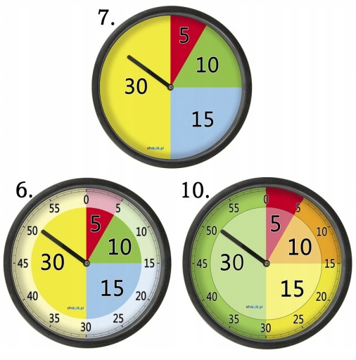 Wzory nr 6, 7 i 10 są zegarami z tarczą w postaci Planu Daltońskiego. Zegary posiadają jedną dużą wskazówkę odmierzającą czas. Pozwala to zrozumieć dzieciom długość upływającego czasu. Mają za zadanie zilustrować specjalną tarczą przedział czasowy 5-, 10-, 15-, 30- minutowy. Podczas pracy określamy kolorem czas na wykonanie zadania , ustawiając pokrętłem wskazówkę na początku odpowiedniego koloru.