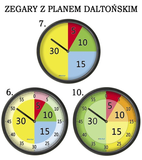 Wzory nr 6, 7 i 10 są zegarami z tarczą w postaci Planu Daltońskiego. Zegary posiadają jedną dużą wskazówkę odmierzającą czas. Pozwala to zrozumieć dzieciom długość upływającego czasu. Mają za zadanie zilustrować specjalną tarczą przedział czasowy 5-, 10-, 15-, 30- minutowy. Podczas pracy określamy kolorem czas na wykonanie zadania , ustawiając pokrętłem wskazówkę na początku odpowiedniego koloru.