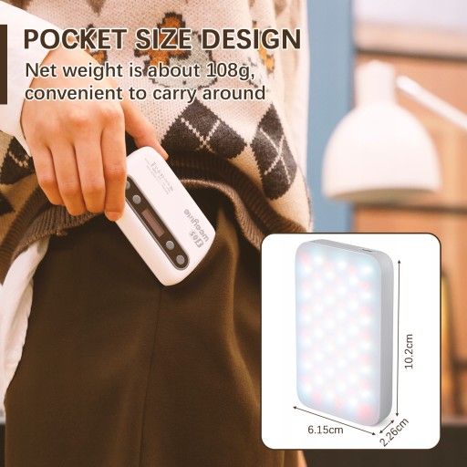 【Wysoka jasność i wysoki współczynnik CRI】 Przyjmuje 108 sztuk wysokiej jakości koralików LED, mocy wyjściowej 5 W, RA≥95 i TLCI≥97, wysokiej jasności i wysokiej czułości reakcji kolorystycznej. Kieszonkowa konstrukcja, waga netto wynosi około 108g, wygodna do noszenia w przypadku vloga na świeżym powietrzu, transmisji na żywo, fotografii itp.