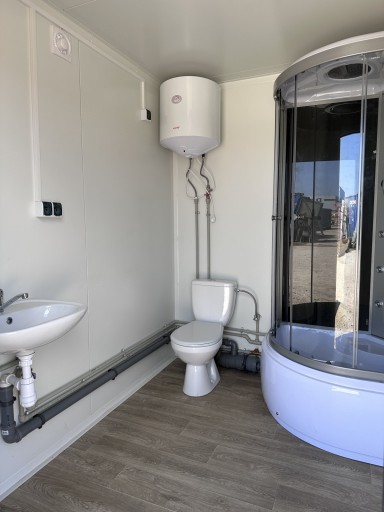 Kontener wykonany z płyty obornickiej grubości 5 cm. Wykonane kompletne instalacje hydrauliczne wod-kan (przyłącza zewnętrze: kanalizacja 110 / + woda 3/4 cala ) oraz elektryczna (230V). Podgrzewacz wody przepływowy zainstalowany przy baterii. Wentylacja grawitacyjna. Kontener przygotowany do załadunku/rozładunku przy pomocy wózka widłowego.