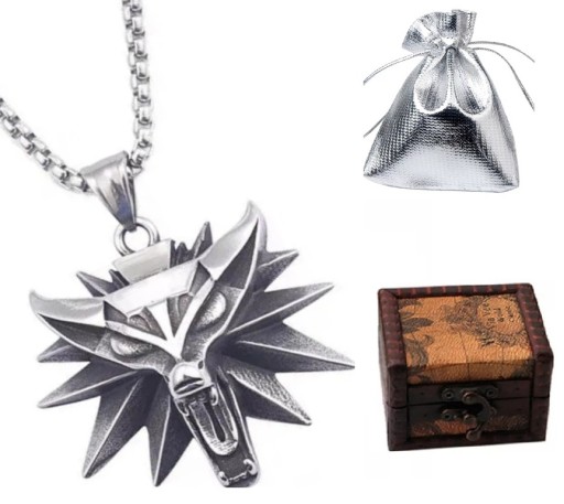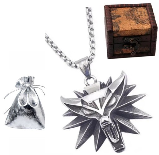 Naszyjnik Wiedźmin medalion Wilk Geralt pudełko drewniane stal chirurgiczna