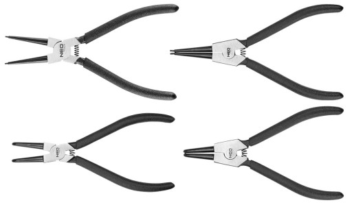 - Zestaw czterech szczypiec segera marki NEO, przeznaczonych do pracy z pierścieniami osadczymi sprężynującymi.