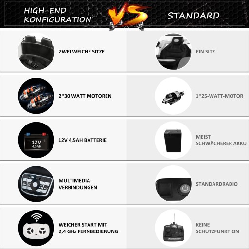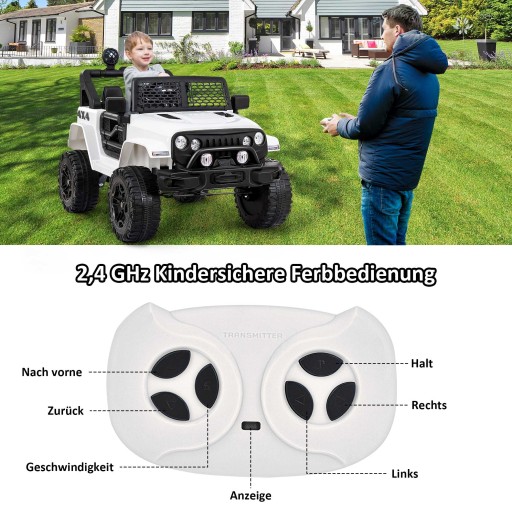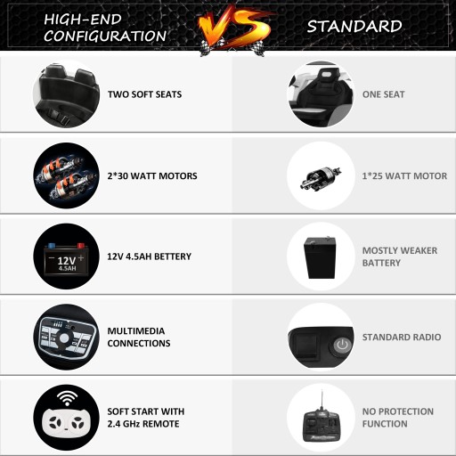 Ten samochód elektryczny posiada funkcję łagodnego startu z funkcją awaryjnego zatrzymania i zdalnego hamowania. Dwa siedzenia w tym elektrycznym samochodzie są wyposażone w pasy bezpieczeństwa. Rodzice mogą sterować tym samochodem elektrycznym bezpośrednio za pomocą pilota 2,4 GHz, a polecenia zdalnego sterowania mają pierwszeństwo przed poleceniami jazdy. Dzięki temu rodzice mogą zagwarantować bezpieczeństwo jazdy, gdy dzieci jeżdżą tym samochodem.