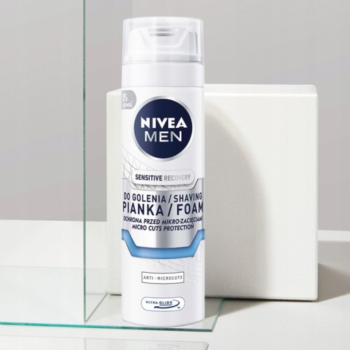 NIVEA MEN SENSITIVE RECOVERY REGENERUJĄCA PIANKA DO GOLENIA Bezalkoholowa*, regeneracyjna pianka Sensitive Recovery chroni skórę przed mikro-zacięciami podczas golenia.
