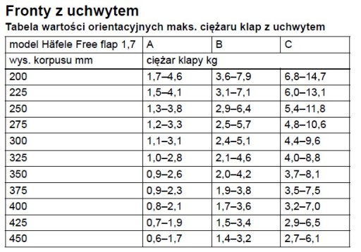 Wybór modelu zależy od wysokości korpusu oraz ciężaru całkowitego frontu. Wyboru należy dokonać na podstawie załączonej tabeli. W przypadku wartości pomiędzy modelami zaleca się wykorzystanie mocniejszej opcji siły.