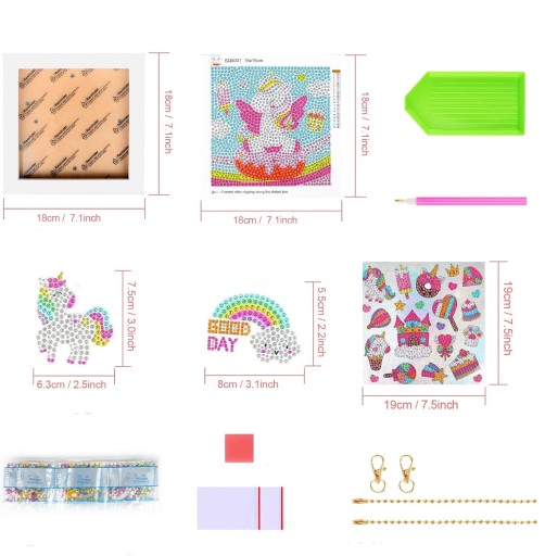 Zawartość opakowania : ramka, płótno z szablonem obrazka, naklejki, 2 łańcuszki, 2 zapięcia , diamenciki, klej, pojemnik, aplikator