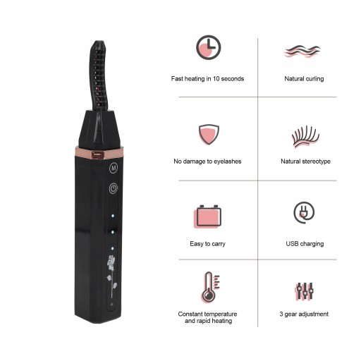 10-sekundowe podgrzewanie, naturalna lokówka, brak uszkodzeń rzęs, naturalne stereotypy, łatwość przenoszenia, ładowanie USB, podgrzewanie w stałej temperaturze, regulacja 3 biegów.