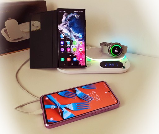 Bezprzewodowa ładowarka specjalnie kompatybilna z telefonami komórkowymi Samsung, zegarkiem i słuchawkami jednocześnie.