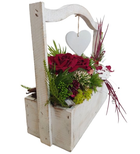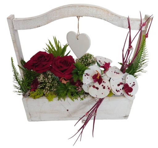Stroik składa się z wysokiej jakości, czerwonych róż i storczyków oraz dodatków ozdobnych umieszczonych w drewnianej donicy.