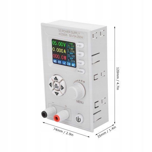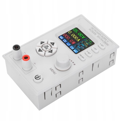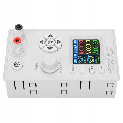 - <h2>Specyfikacja:</h2><ul><li>Typ artykułu: zasilacz regulowany DC</li><li>Materiał: ABS</li><li>Model: WZ5005</li><li>Zakres napięcia wejściowego: DC6-55V</li><li>Zakres napięcia wyjściowego: DC0-50V</li><li>Zakres prądu wyjściowego: 0-5A</li><li>Zakres mocy wyjściowej: 0-250W</li><li>Wyświetlacz: kolorowy wyświetlacz LCD o przekątnej 1,8 cala</li><li>Rozmiar: wys. x szer. x wys.: ok. 120 x 74 x 35 mm / 4,7 x 2,9 x 1,4 cala</li></ul>. Zasilacz stabilizowany DC Sterowanie cyfrowe