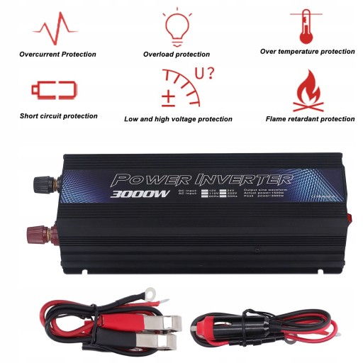 1. MOCNE WYJŚCIE: Konwersja prądu stałego 12 V na prąd zmienny. Zapewnia 3000 watów mocy fali sinusoidalnej. Wyposażony w 1 gniazdo prądu zmiennego i 1 port USB do uniwersalnego ładowania