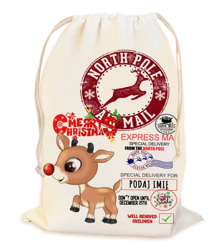 PERSONALIZOWANY WOREK Z IMIENIEM WYKONANY Z BAWEŁNY ORGANICZNEJ O GRAMATURZE 200 g/m2 ŚCIĄGANY Z DWÓCH STRON BAWEŁNIANYM SZNURKIEM. SUPER ROZWIĄZANIE NA PAKOWANIE ŚWIĄTECZNYCH PREZNTÓW POD CHOINKĘ, SZCZEGÓLNIE DLA DZIECI.