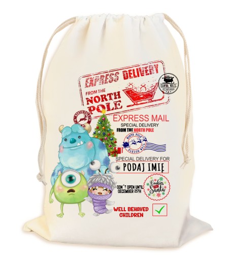 PERSONALIZOWANY WOREK Z IMIENIEM WYKONANY Z BAWEŁNY ORGANICZNEJ O GRAMATURZE 200 g/m2 ŚCIĄGANY Z DWÓCH STRON BAWEŁNIANYM SZNURKIEM. SUPER ROZWIĄZANIE NA PAKOWANIE ŚWIĄTECZNYCH PREZNTÓW POD CHOINKĘ, SZCZEGÓLNIE DLA DZIECI.