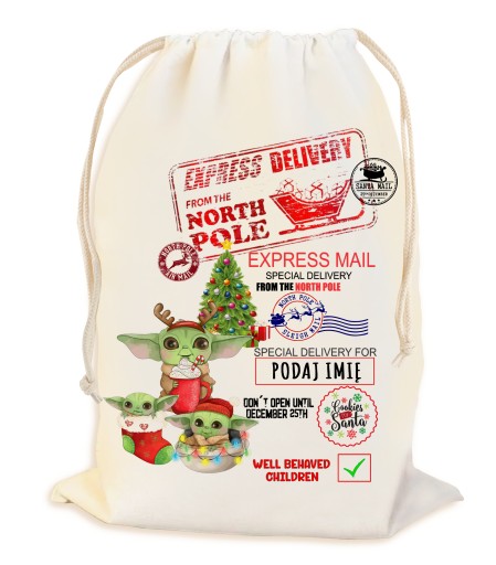 PERSONALIZOWANY WOREK Z IMIENIEM WYKONANY Z BAWEŁNY ORGANICZNEJ O GRAMATURZE 200 g/m2 ŚCIĄGANY Z DWÓCH STRON BAWEŁNIANYM SZNURKIEM. SUPER ROZWIĄZANIE NA PAKOWANIE ŚWIĄTECZNYCH PREZNTÓW POD CHOINKĘ, SZCZEGÓLNIE DLA DZIECI.