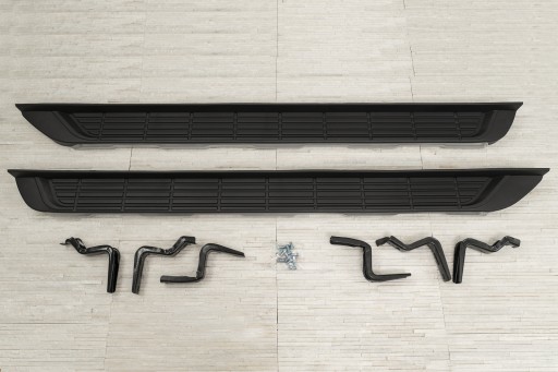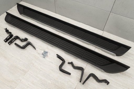 W zestawie komplet stopni bocznych (prawy i lewy), elementy montażowe oraz instrukcja. Progi montowane są na fabrycznych punktach montażowych. Montaż stopni nie wymaga wiercenia dodatkowych otworów! Zalecamy profesjonalny montaż w warsztacie (z doświadczenia wiemy że najlepiej skorzystać z usług zakładu lakierniczego lub blacharskiego ponieważ to te zakłady zajmują się najczęściej montażem listew, dokładek oraz stopni, więc montaż dla tych zakładów jest czynnością intuicyjną).