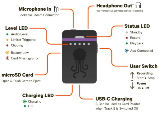 TRACK E wykorzystuje wymienną kartę microSD do nagrywania dźwięku. Limiter wejściowy i filtr górnoprzepustowy gwarantują nieskazitelną jakość nagrywania. Przykręcane złącze mini jack zapewnia maksymalne bezpieczeństwo podłączania mikrofonów. TRACK E posiada zasilanie 5 V do obsługi szerokiej gamy mikrofonów. Do każdego zakupu TRACK E dołączona jest bezpłatna licencja Tentacle Sync Studio (Mac).