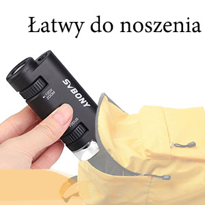 - Mikroskop kieszonkowy; wymiary 13 x 13 x 4cm i waga 180g to niepowiązany problem; jeśli włożysz go do torby lub trzymasz w dłoni; wymiary 60 x 120 x