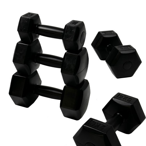 Hantle bitumiczne, czarne marki BodyNetics. Profilowany uchwyt. Obciążenia w formie sześciokąta.