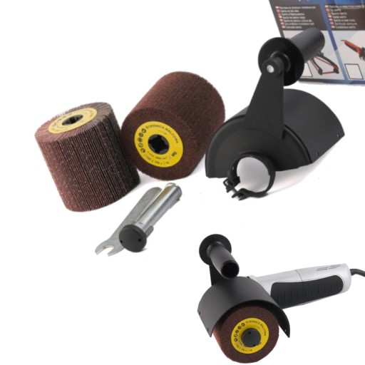 - Do przystawki dokupić można również specjalną oponę, na którą mocowane mogą być pasy bezkońcowe umożliwiające obróbkę stali i stali nierdzewnej.