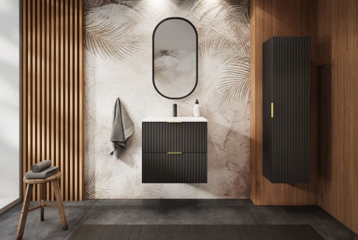 Stworzona w nowoczesnym i stylowym designie, ta kolekcja wyróżnia się modnymi, ryflowanymi frontami, wykonanymi z wysokiej jakości płyty MDF. Korpus mebli z płyty laminowanej gwarantuje trwałość i odporność na warunki łazienkowe.