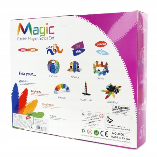 Zestaw składa się z pasków magnetycznych oraz elementów łączących. Unikalny kształt i materiał pozwala dzieciom łatwo zginać, łączyć lub układać paski magnetyczne ze sobą i tworzyć różne kształty.