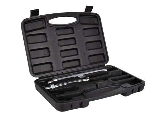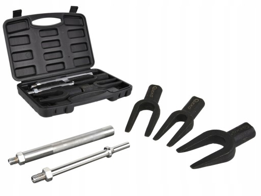 Zestaw zawiera trzy ściągacze widełkowe o szerokości wewnętrznej 28, 24, 17 mm oraz dwie rękojeści do dociskania, przystosowane do pracy z młotkiem pneumatycznym lub ręcznym.