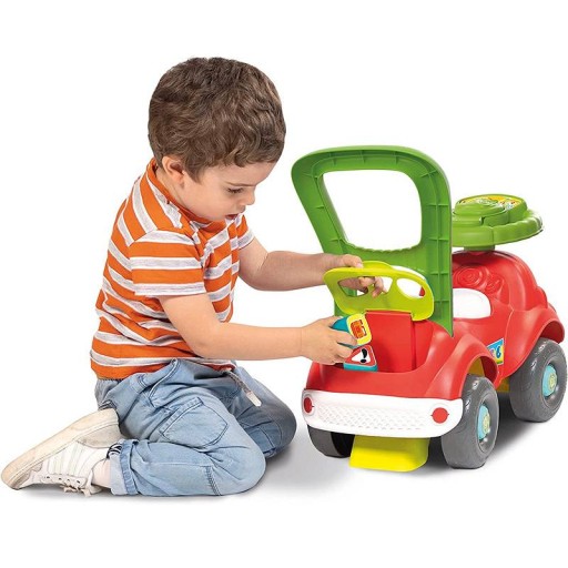 • Zawiera elementy stymulujące sprawność manualną i wyobraźnię, takie jak klakson, otwierana maska z kołami zębatymi, sorter kształtów czy otwierany bagażnik.