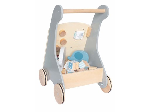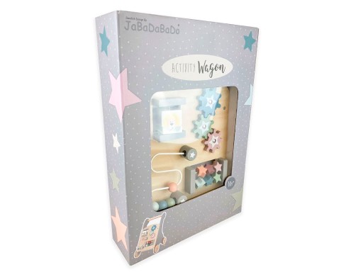 Drewniany edukacyjny pchacz marki Jabadabado został stworzony z myślą o dzieciach by ułatwieć im stawianie pierwszych kroków. Uroczy chodzik będzie towarzyszył Twojemu maluchowi w chodzniu trzymając za rączkę jak również w edukacyjnym rozwoju stymulując go do kreatywnej zabawy i poznawania otaczającego go świata. Chodzik posiada wiele ciekawych i interesujących dla dziecka funkcji takich jak: koła zębiaste przeplatankę czy tez obracające się klocki z wizerunkami zwierząt oraz obracane gwiazdki. Dzięki temu że zabawka łączy w sobie wiele różnych edukacyjnych funkcji przez długi czas nie znudzi się Twojemu dziecku a także pomoże rozwinąć wiele umiejętności z zakresu motoryki małej i dużej oraz wspomoże koordynację wzrokowo- ruchową dziecka. Całość utrzymana w stylowej spokojnej kolorystyce pasującej do każdego wystroju dziecięcych wnętrz. Pchacz posiada regulowane gumpwe kółka zaprojektowane tak nie pozostawiać śladów na podłodze. Ten stylowy edukacyjny pchacz chodzik jeżdzik rozwija: