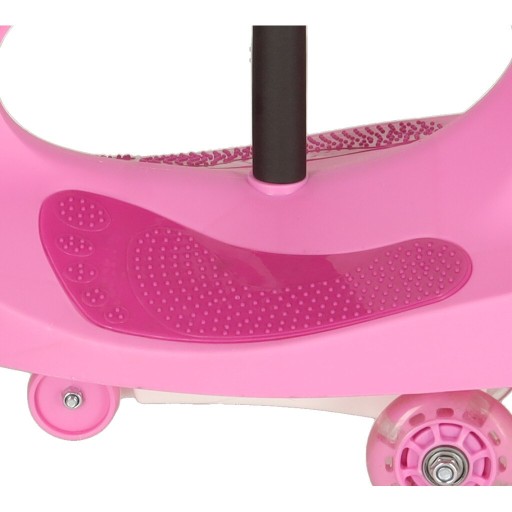 Dodatkowym elementem przyciągającym uwagę są świecące kółka, które sprawiają, że jeździk jest jeszcze bardziej atrakcyjny dla dziecka.