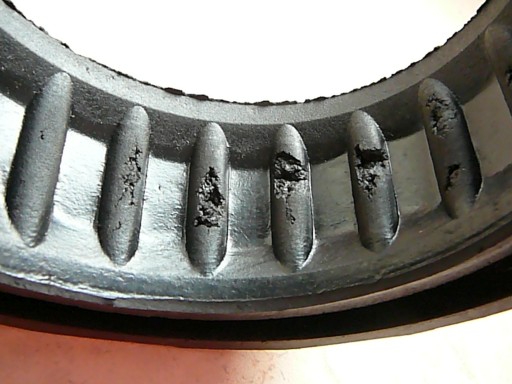 Prowadzę hurtownię motoryzacyjną oraz sprzedaż wysyłkową. Przedstawiam zestaw nowych, gumowych wkładek usztywniających sprężyny śrubowe, których średnica zewnętrzna ma od 140 do 160 mm, a odległość między zwojami wynosi 30 mm. Dystanse mają wady widoczne na zdjęciach, w postaci wżerów w gumie. Ich brzydki wygląd nie powinien mieć wpływu na wytrzymałość.