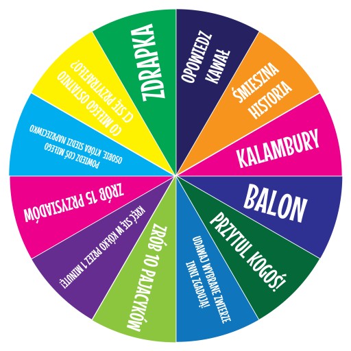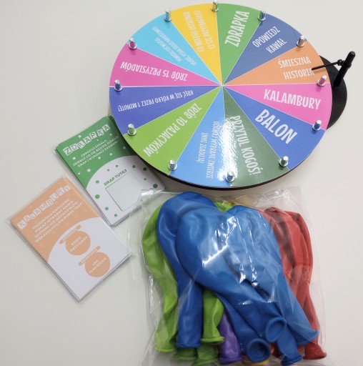 Wyjątkowa zabawa dla dzieci z kołem fortuny i masą dodatkowych atrakcji w postaci balonów, kart zdrapek i kart kalambur.